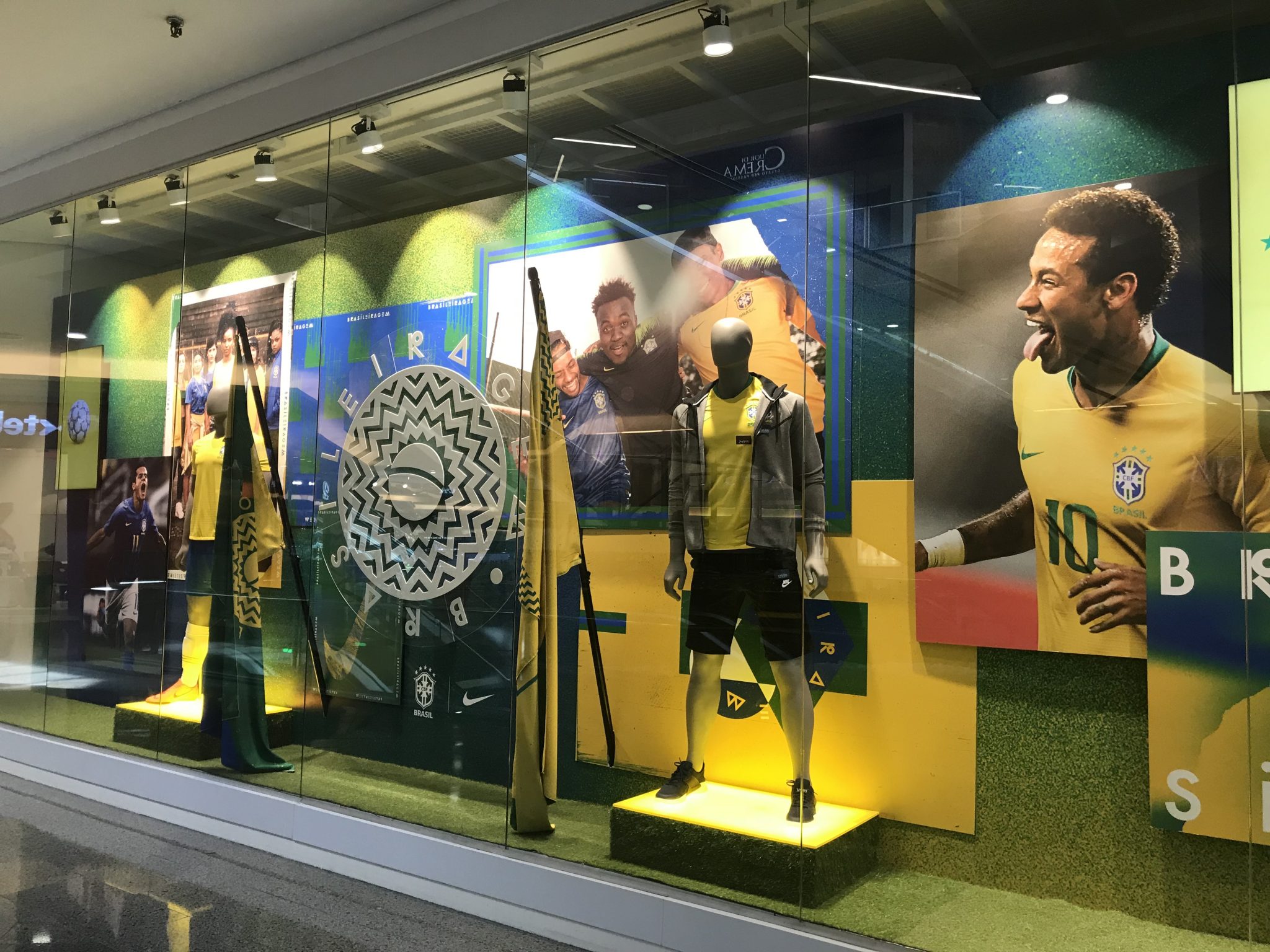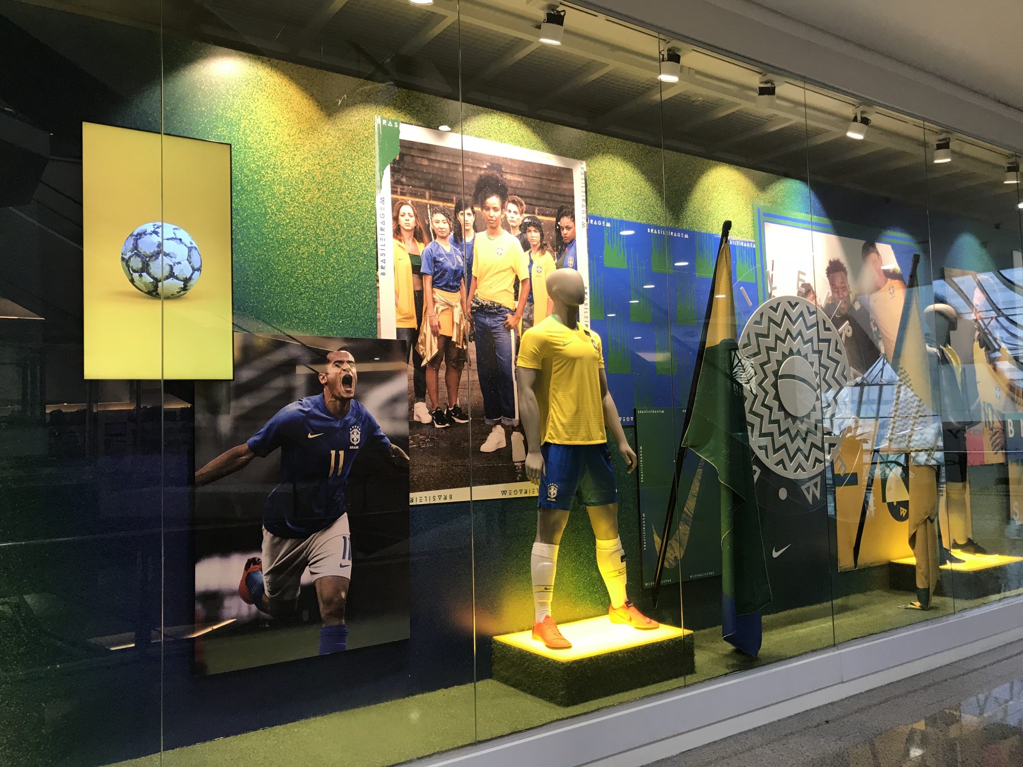 Neste caso, a ideia é trazer elementos bem brasileiros para a vitrine. Foi isso que a Centauro fez, explorando a nova camisa da seleção da Nike, que diz que o futebol está no nosso sangue.
