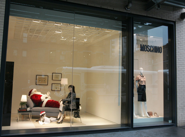 Este é um exemplo sensacional do Papai Noel numa situação inusitada na vitrine de Natal da loja Moschino.