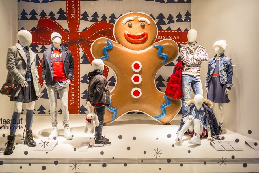 A segunda vitrine usa o simpaticíssimo Gingerbread Man e explora muito bem a escala para chamar a atenção de quem passa na frente da loja.